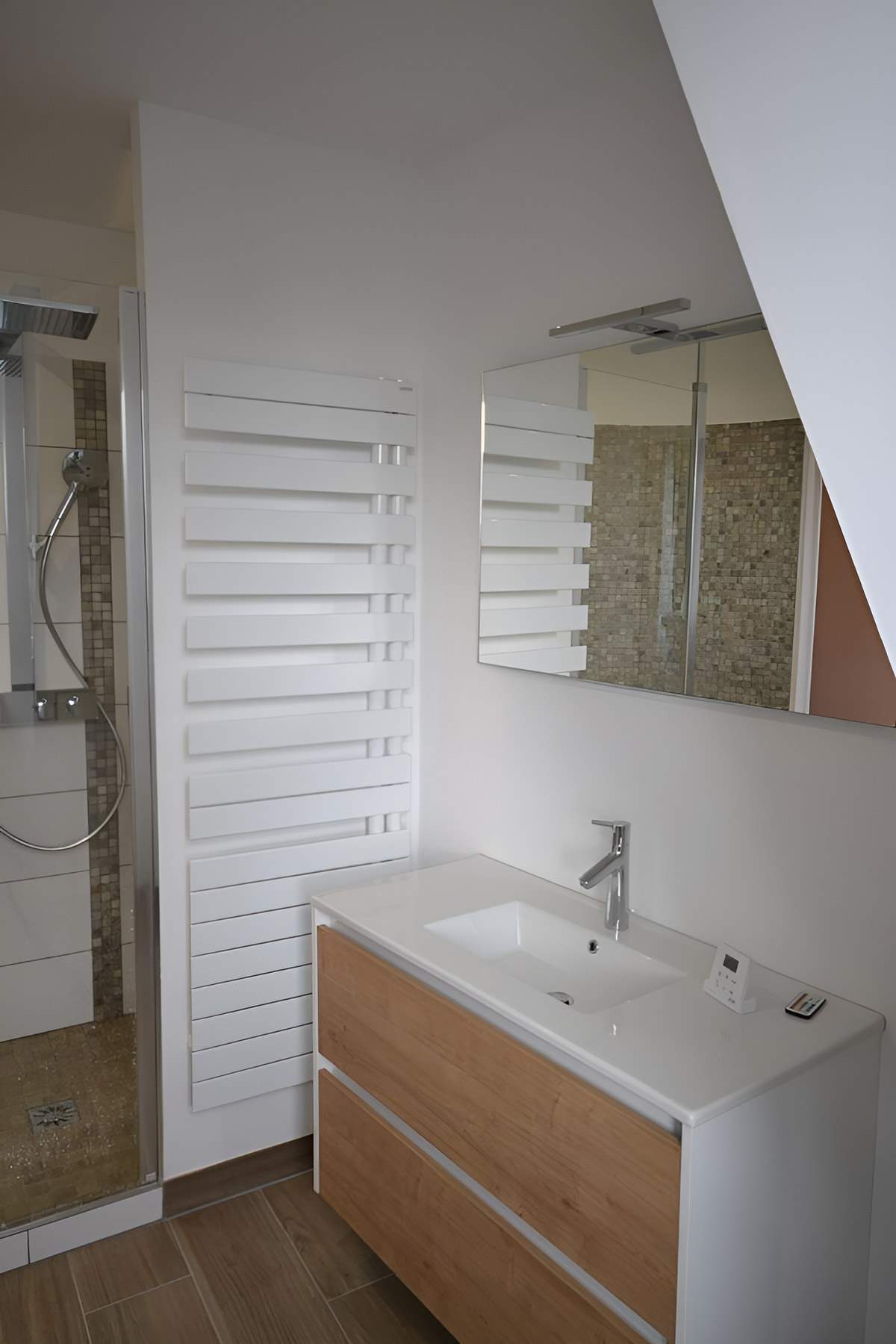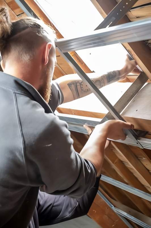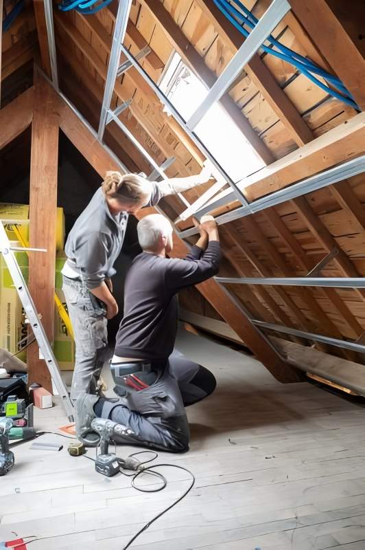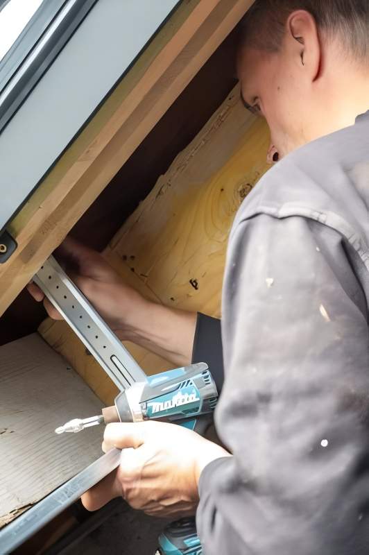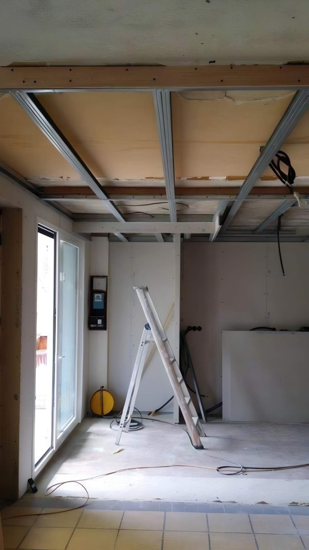 Dépose des boiseries, traitement des surfaces, réfection de jambages maçonnés et pose d'un plancher en poutrelles et hourdis béton.